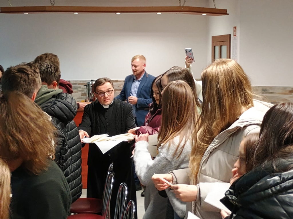 Po Mszy św. w dolnym kościele miało miejsce młodzieżowe spotkanie opłatkowe. Przy nastrojowym kolędowaniu życzenia składali sobie wzajemnie: ks. Piotr Kosakowski, Ks. Kan. Jerzy Filek- proboszcz Parafii Niepokalanego Serca Najświętszej Maryi Panny, ks. Marcin Meres – wikariusz ww. parafii, ks. Sławomir Filipek z parafii św. Barbary, młodzieżowe grupy parafialne z Dekanatu Trzebińskiego, kandydaci do bierzmowania, Liturgiczna Służba Ołtarza oraz schola „Ichtis”, która swoim śpiewem ubogaciła całe niedzielne spotkanie.